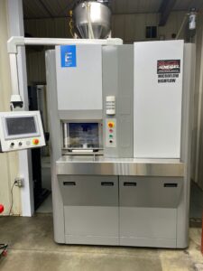 This is a 5 axis, camera guided EDM machine. This machine can process holes from four thousandths to forty thousandths and every ten thousandths of an inch in between. This means there are over 421 sizes of electrodes available to create any size custom nozzle per customers request.